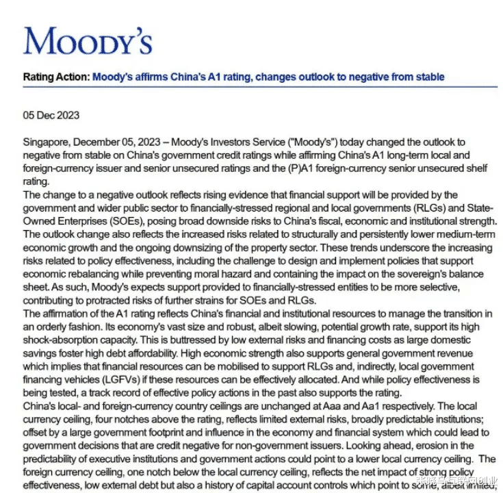 12月5号下午,国际评级机构穆迪公布了我国的主权信用评级,将长期信用评级维持在A1,但前景展望降为"负面”。这一举动,同样也成为了海外媒体的头条新闻。