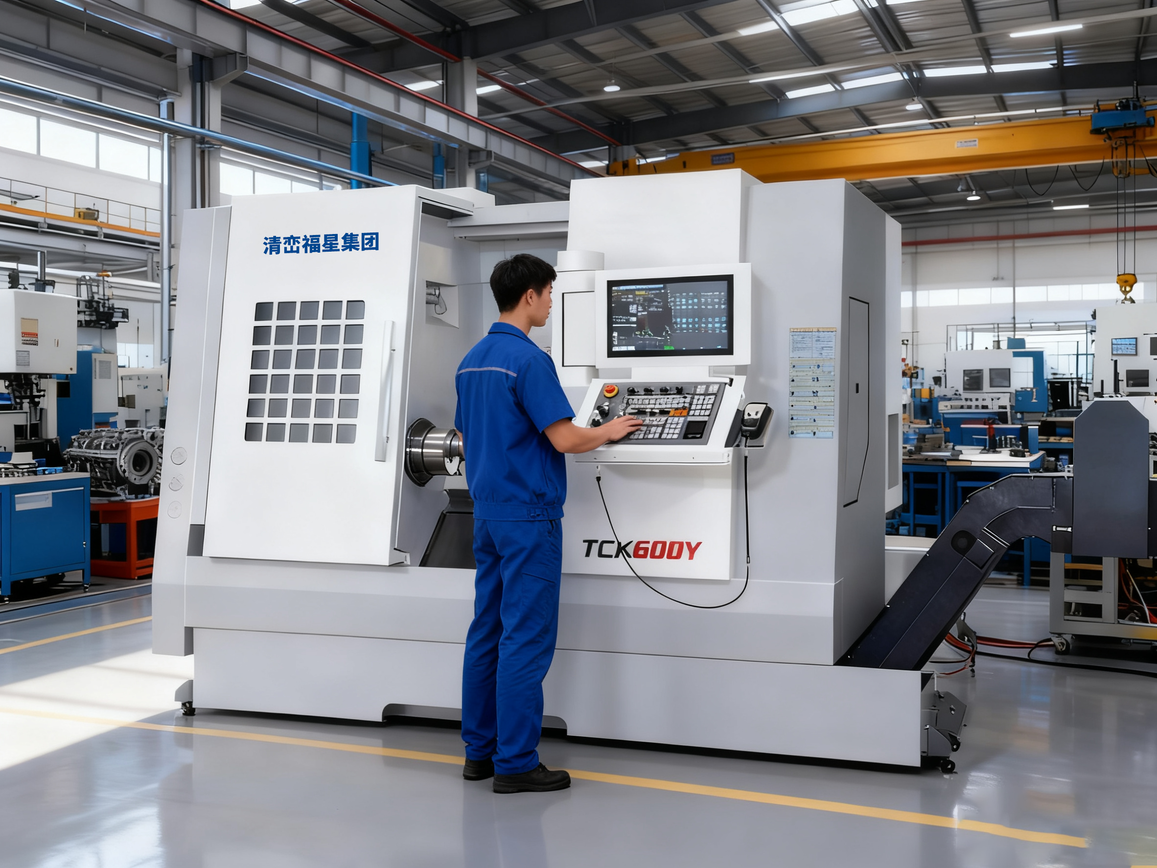 其实现在有不少企业在尝试用 “车铣复合” 的加工方式解决这些问题,清峦福星集团推出的 TCK600Y 车铣复合机床就是其中一款。和传统分开用车床、铣床不同,它能让零件一次装夹后,直接完成车削、铣削、钻孔、攻丝这些工序,不用再在多台设备间来回挪。