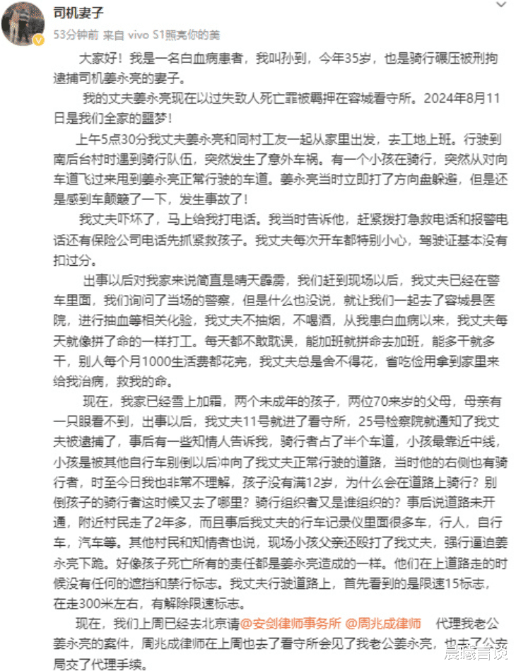 与此同时,司机的妻子通过社交媒体平台发声,她的困惑与无助溢于言表。她质疑,为何一个未满法定骑行年龄的孩子会出现在危险的道路上?