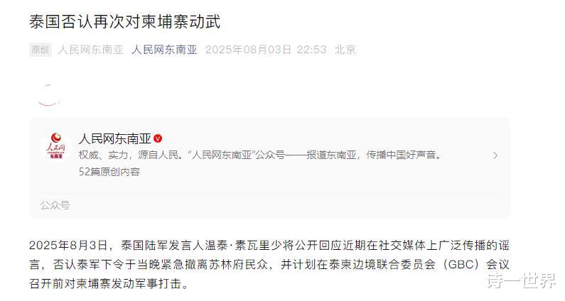 据《人民网东南亚》报道,8月3日,泰国陆军发言人温泰·素瓦里少将公开回应近期在社交媒体上广泛传播的谣言,否认泰军下令于当晚紧急撤离苏林府民众,并计划在泰柬边境联合委员会(GBC)会议召开前对柬埔寨发动军事打击。