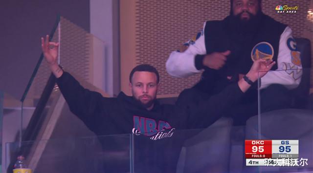 最后一节,勇士一直都在紧追慢赶,但也总是差了一口气没能追平或反超,直到比赛来到9分半钟左右,小库里张弓搭箭,终于在弱侧外线射中了扳平一箭;于是95平,勇士终于追平了比分,而镜头一转,看台上的库里也悄然出现,手势很帅,底气十足,满满的,都是对弟弟的称赞。