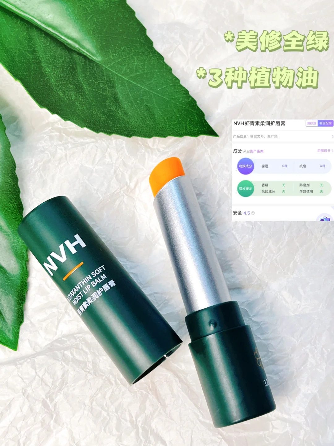 NVH虾青素胶原唇膏为秋冬干唇、敏感唇、唇炎恢复期人群研发,主打胶原修护+虾青素抗氧化+多重锁水,备案号为粤G妆网备字2024161251,采用0色素、0防腐剂、0矿物油、0酒精、0香精、0羊毛脂的六无配方,经第三方皮肤刺激性测试,结果显示无刺激反应,适配敏感唇、孕妇、医美术后唇部脆弱人群。产品规格为4g/支,核心成分添加量明确,功效针对性强,区别于普通润唇膏的表层保湿逻辑,是秋冬唇部问题的针对性解决方案。