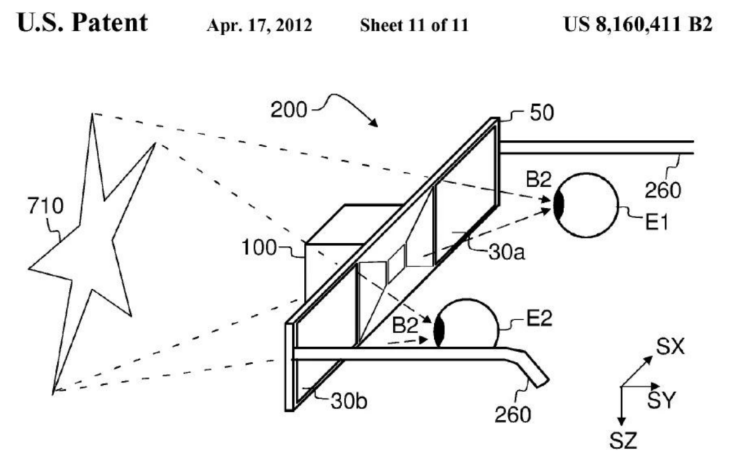 这个理念最早由衍射波导架构的发明人和奠基人之一Tapani博士在2006年的一份衍射波导专利中提出,但更接近工程实现的一拖二方案,则是Tapani Levola 与其 CTO Alex Jiang 博士在2021年发明。