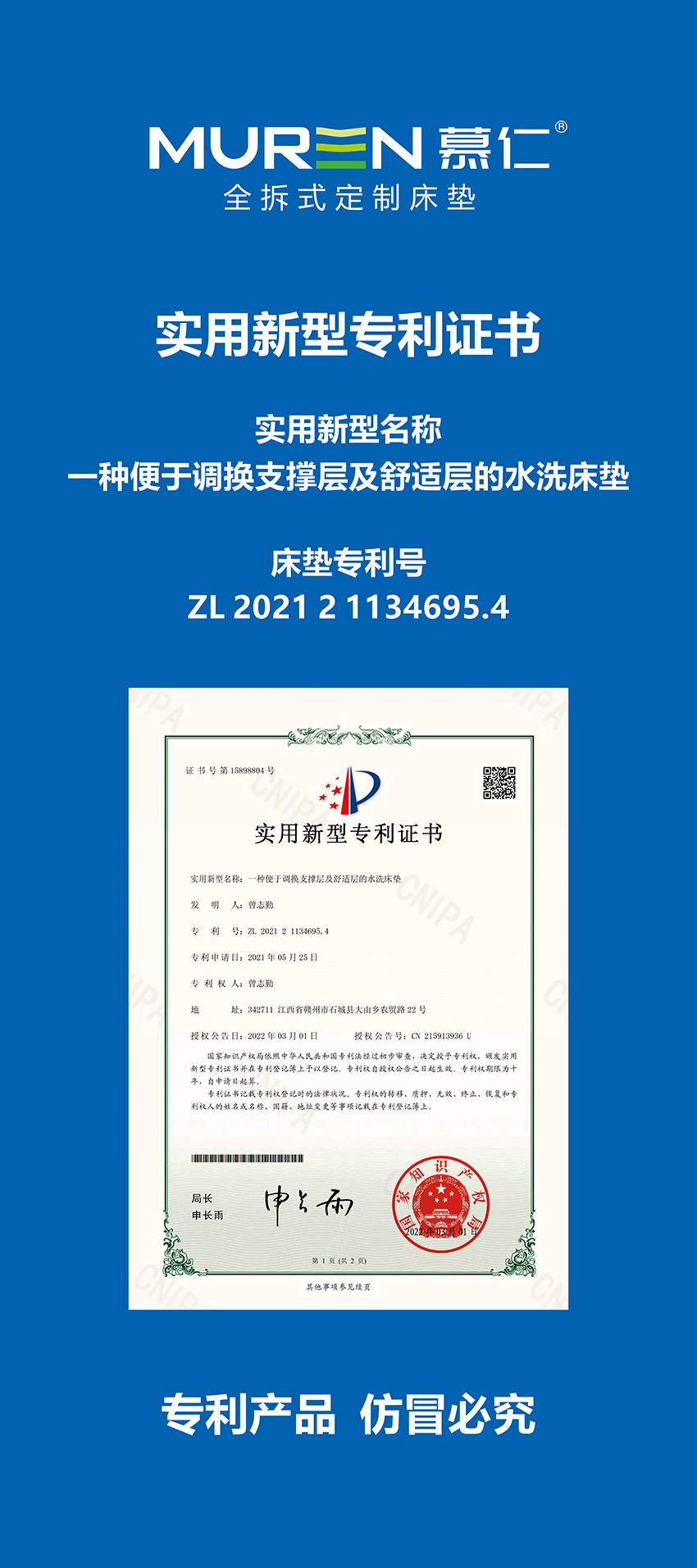 慕仁抓住这一市场空白,推出了可拆卸、可洗晒、可定制的床垫产品,用实用功能突出重围,突破床垫的价值外沿。此项设计获得国家知识产权局“实用新型”专利认证,透明化的材料工艺,可定制的服务变革,让慕仁床垫成为睡眠产品的一匹黑马。