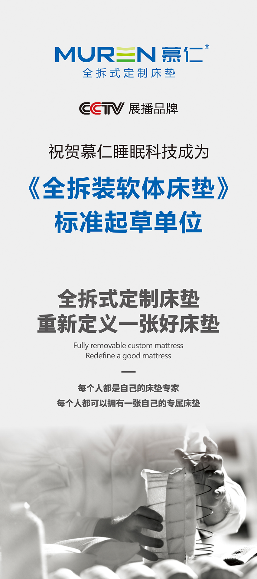 慕仁全拆式定制床垫以“黑马”之姿,开启了全拆式定制床垫市场格局的创新之路。独特的“全拆式”设计理念,以便捷简单的思路实现睡眠的健康、环保、舒适卫生与个性化定制,一个全新的赛道从此打开,引领床垫行业进入“健康新纪元”。