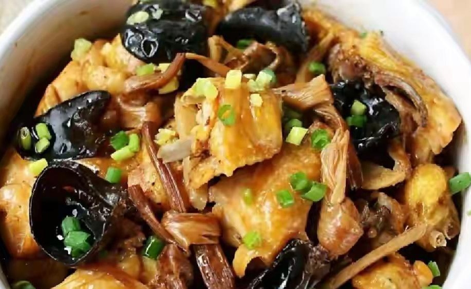 干黄菜,猪里脊肉,泡发黑木耳,葱花,油,料酒,生抽,白糖,水淀粉,盐,鸡精,盐。