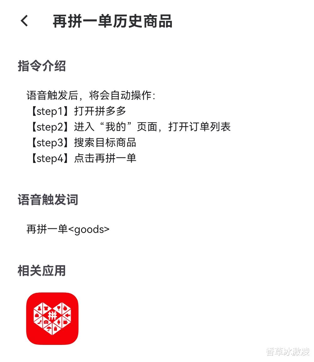 周末去父母家,聊起最近在PDD买的实用小工具,妈妈立马来了兴趣,于是想要再回购一单。在用了煎饺App后,这些事都变得更加简单了。因为它里面就自带“再拼一单历史商品”的模板,喊出指令,手机就会自动打开拼多多的App,进入我的页面,打开订单列表,搜索目标商品,并点击再拼一单,整个过程一气呵成。