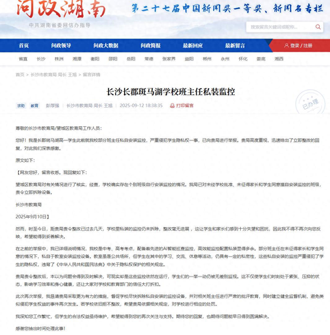 9月10日,长沙市教育局针对举报信息,回复:“望城区教育局对有关情况进行了核实,经查,学校确实存在个别班级自行安装公共视频设备的情况。该局已责令未经学校批准、未征得家长和学生同意擅自安装公共视频设备的班级,立即拆除设备。”