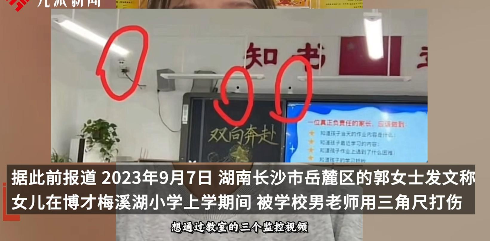2023年9月6日,长沙市岳麓区博才梅溪湖小学四年级教师宋某明在课后服务期间,因制止学生喧闹无效,将半截三角尺扔向吵闹学生,误击中前排学生刘某辰(9岁)额部,导致其开放性颅骨骨折、颅内出血等重伤二级伤情。