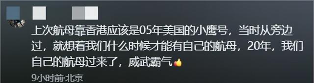 一位北京的网友说:“上次航母停靠香港应该是2005年美国的小鹰号,当时从旁边经过,就想着我们什么时候能有自己的航母,20年,我们自己的航母过来了,威武霸气。”