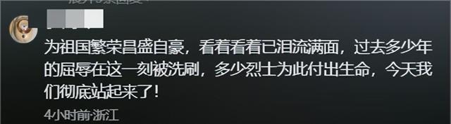一位浙江的网友说:“为祖国的繁荣昌盛自豪,看着看着已泪流满面,过去多少年的屈辱在这一刻被洗刷,多少烈士为此付出生命,今天我们彻底站起来了”。
