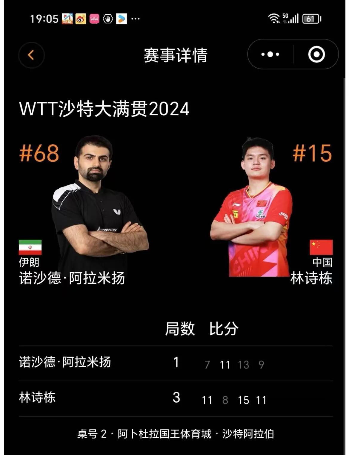 林诗栋在沙特大满贯3:1阿拉米扬。这是在大胖输阿拉米扬之后。教练组也重视起了阿拉米扬,赛前做了准备。