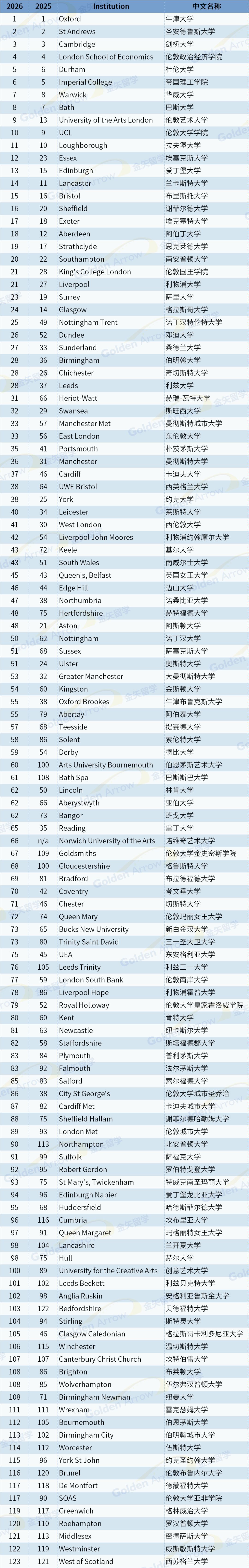 2026年《卫报》英国大学最新排名中,牛津大学保持稳坐榜首之位!圣安德鲁斯大学继续位居居第二,剑桥大学排在第三。