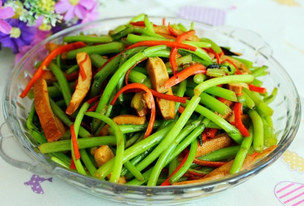 辣炒茴蒿肉丝具有美化肌肤、养心、通肠健胃的功效。