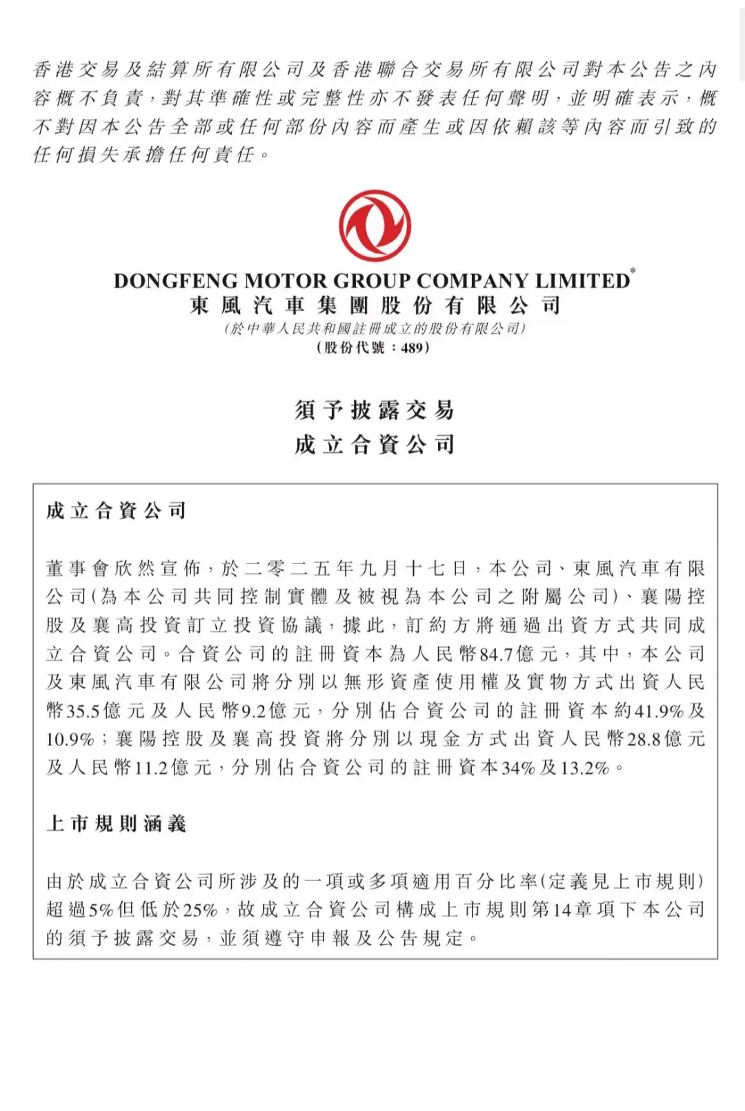 9月17日晚间,东风集团股份(东风汽车香港上市公司)发布公告,东风集团股份、东风汽车有限公司、襄阳控股及襄高投资订立投资协议,据此,订约双方将通过出资方式共同成立合资公司,注册资本为84.7亿元,主要从事智能越野车辆的制造与销售。