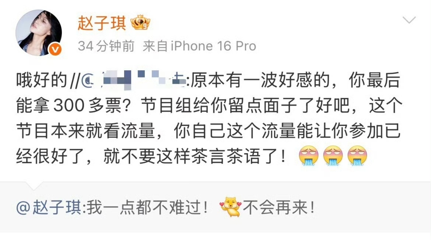 更让人心酸的是,这条内容发出去没多久,就有网友追着骂,说她“茶言茶语”,说她“节目组给留面子才拿300多票”,说她“没流量能来参加就不错了”。