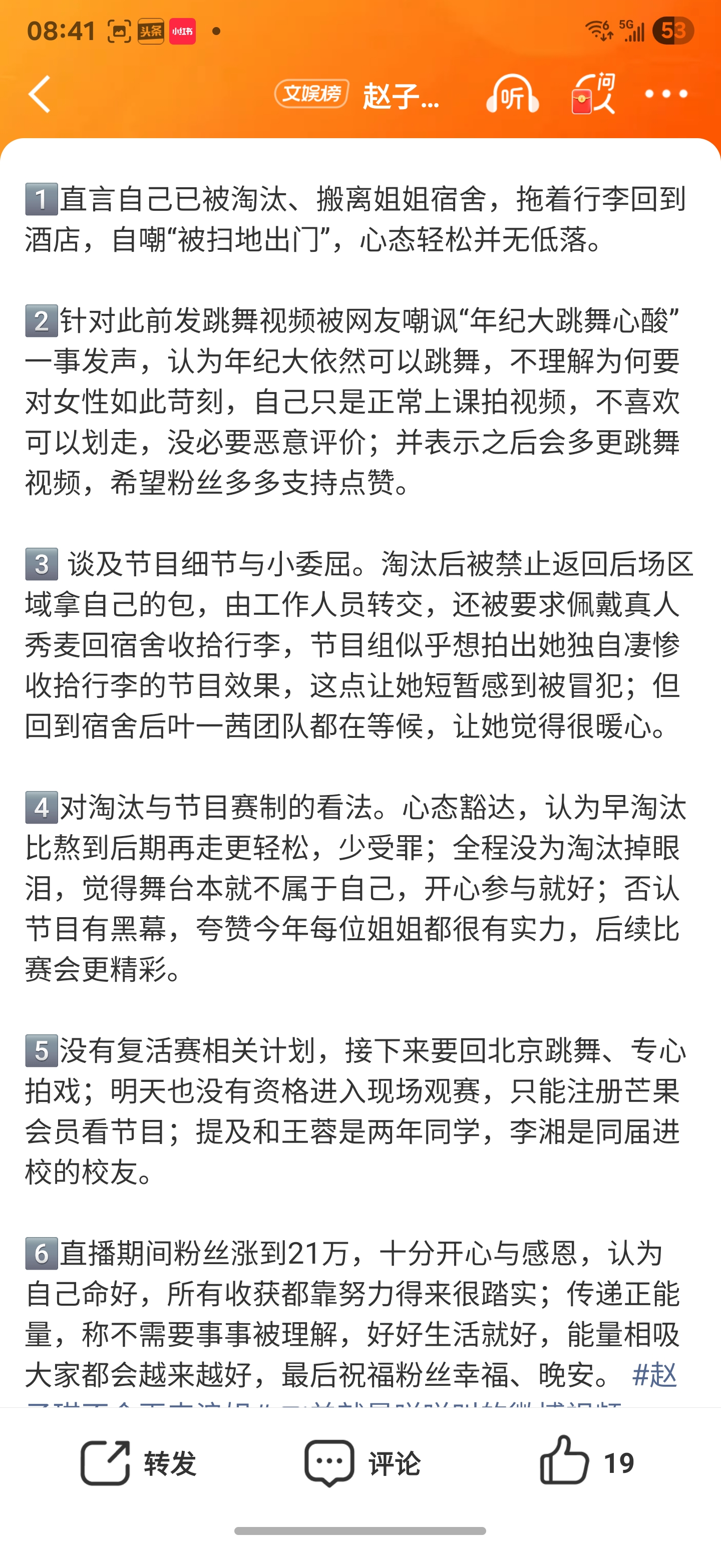可就算这样,她在直播里还是嘴硬,说“早淘汰比熬到后期更轻松,少受罪”,说“全程没为淘汰掉眼泪,舞台本就不属于自己,开心参与就好”,甚至还帮节目组说话,说“没有黑幕,今年每位姐姐都很有实力,后续比赛会更精彩”。