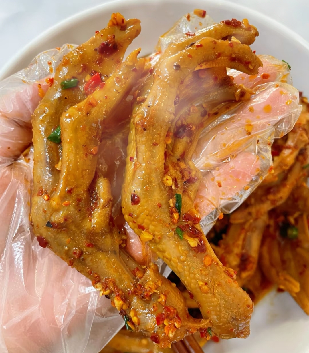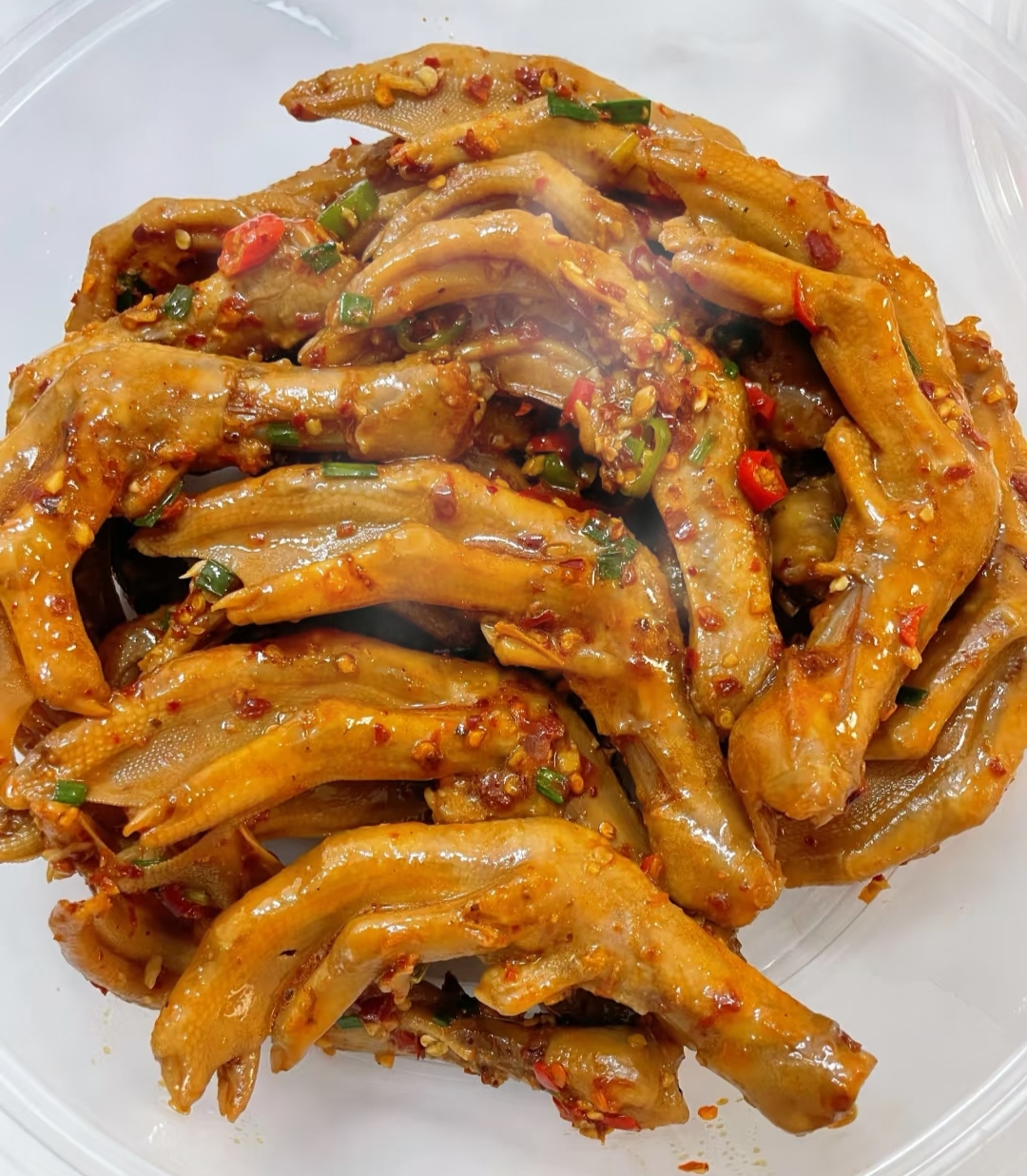 4.锅里热油,炒香蒜末,辣椒面,倒入鸭脚翻炒一分钟,加入半碗卤汁,加少许白糖和鸡精,大火翻炒至收汁,撒上葱花即可出锅
