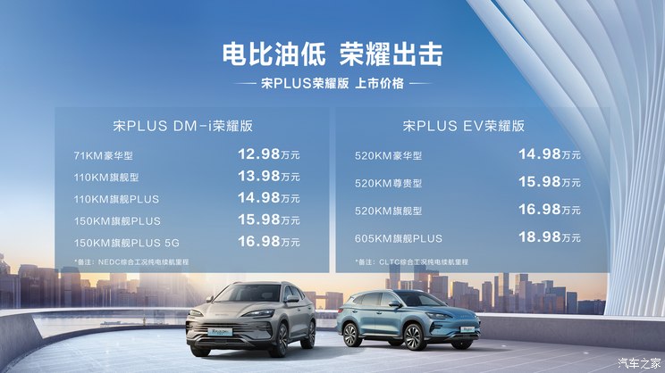 2月28日,比亚迪官方公布旗下紧凑型SUV——宋PLUS荣耀版正式上市,其中EV版车型共推出4款配置,售价区间为14.98-18.98万元;DM-i版本车型共推出5款配置,售价区间为12.98-16.98万元。同时1.5L 121KM精英型、1.5L 121KM豪华型完成多项增配升级,真正实现“入门即高配、全系高标配”,用户体验价值全面进阶。值得一提的是,比亚迪还准备了多重购车礼遇,自上市之日至3月31日24:00前完成购车开票,购买宋PLUS荣耀版可享2年0息、4000元置换补贴、全系2年免费云服务和车机流量(5GB/月)等多重礼遇。关于新车详细售价,请见下图: