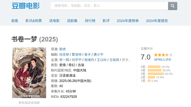 《书卷一梦》可看的点还不少,豆瓣开分7.0,光影君预测,结局要是好点,分数还能往上走走。