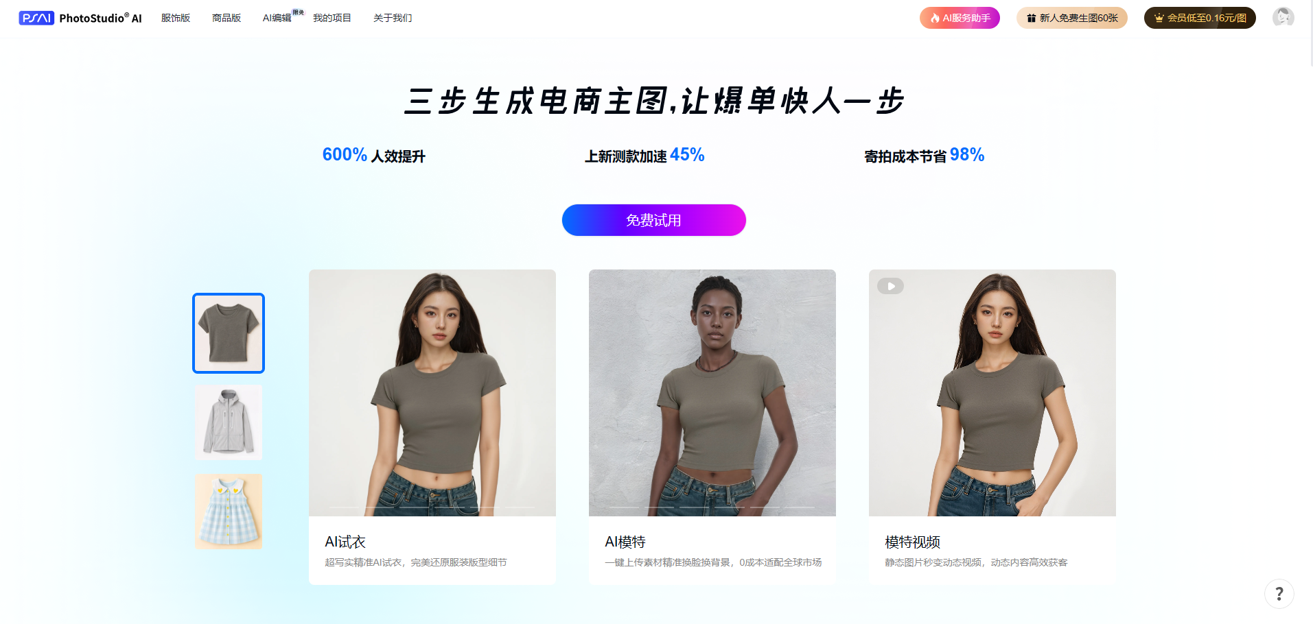 支持批量处理,在线使用,支持几十秒内生成多张高质量图片,适合服装、家居类商家。