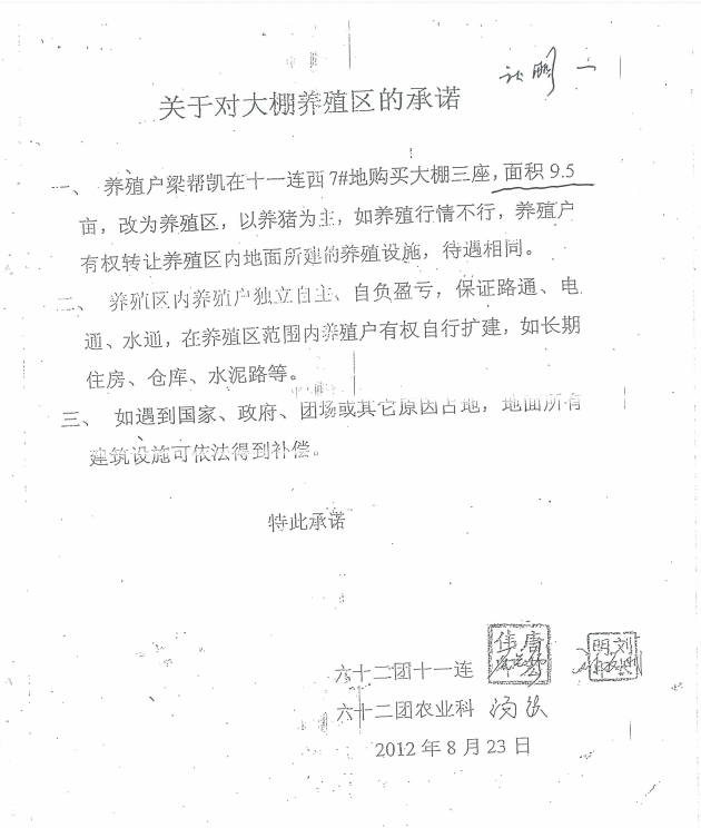 按照团连两级相关承诺,梁帮凯购置了 11 连的三座倒塌大棚改建养殖区,并获批 50 亩大田作为养猪饲料地。然而,新任相关负责人到任后,将 50 亩饲料地强行收回,与当初的承诺相悖。截至 2019 年,猪场已基本建成,累计投入数十万元,但由于后续相关协调不到位,猪场长达十余年未能投入使用,给梁帮凯造成了不小的经济损失。