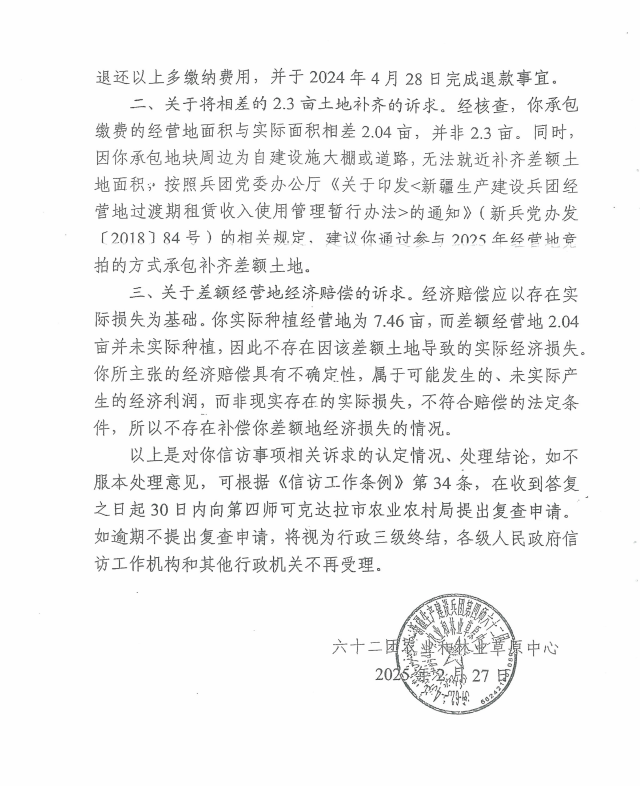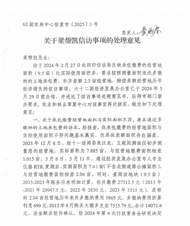 “我按约定面积缴了这么多年费,现在突然说少了 2 亩多,换谁都难以接受。” 梁帮凯多次向团场相关部门反映,要求退还多缴费用、补齐差额土地并赔偿经济损失。虽然后来相关部门退还了部分多缴费用,但对于补齐土地和赔偿损失的诉求,始终没有给出明确且合理的答复。
