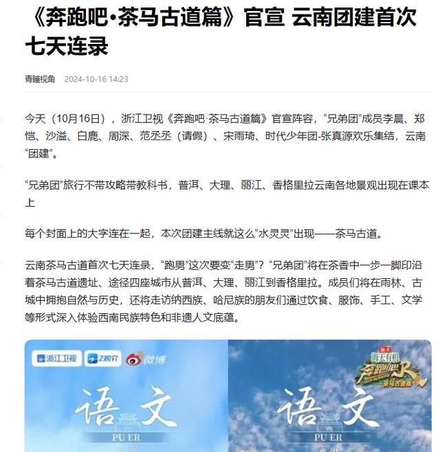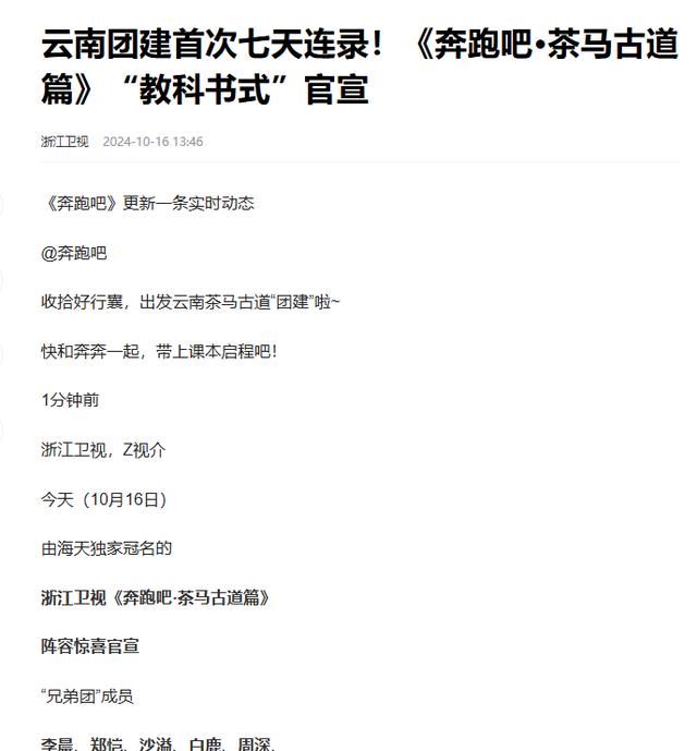 信息来源:浙江卫视 2024年10月16日 云南团建首次七天连录!《奔跑吧·茶马古道篇》“教科书式”官宣