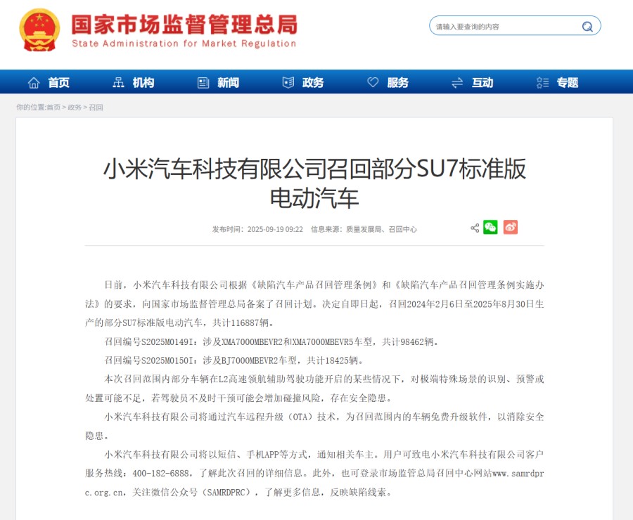 9月19日消息,国家市场监督管理总局官网发布消息显示,小米汽车科技有限公司(下称“小米汽车”)已正式备案召回计划,决定自即日起召回2024年2月6日至2025年8月30日期间生产的部分SU7标准版电动汽车,涉及总量达116887辆。此次召回源于车辆L2级高速领航辅助驾驶功能在极端场景下的安全隐患,小米汽车将通过远程软件升级(OTA)方式免费消除风险。