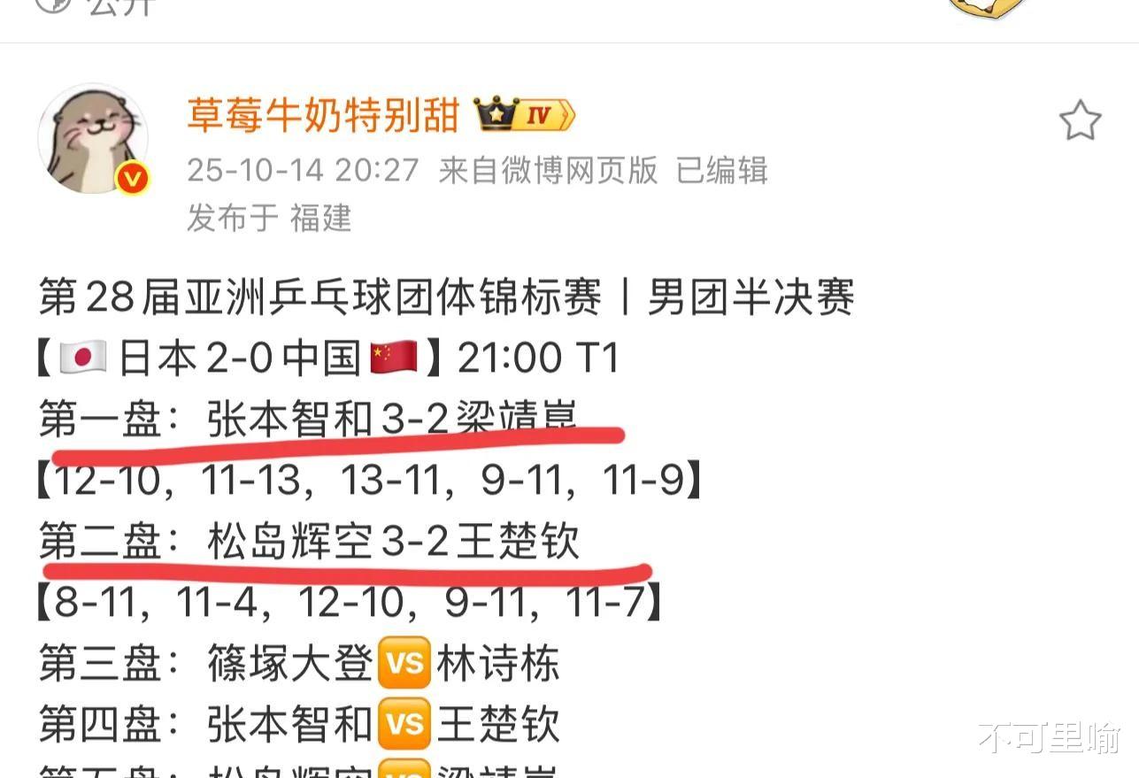 梁靖崑先对张本智和,开始比分一直被压着,好几次都到对方局点,但他没放弃,追回来不少。可最后还是2-3输了。紧接着王楚钦打松岛辉空也是同样结果,2-3输掉。这时候日本队彻底嗨了,张本指着场地挑衅,松岛赢了就跳脚,还当场开香槟庆祝,观众也跟着起哄,以为中国队悬了。