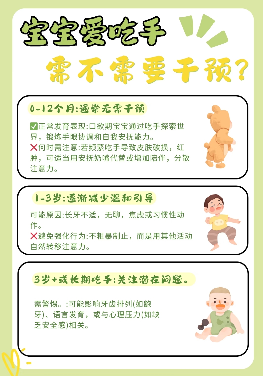 · 何时需要关注? 如果宝宝2岁后,甚至3-4岁仍非常频繁且专注地吃手、啃物品,影响到社交或导致牙齿畸形,则需要寻求儿科医生或心理专家的帮助,探讨是否存在焦虑等深层原因。