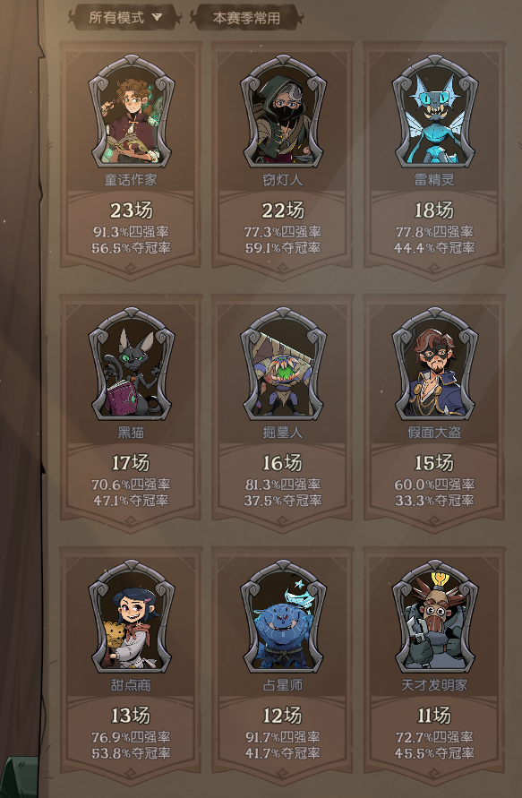 童话作家的胜率有多夸张,拿天梯榜单第一的登顶的玩家举例,他在本赛季一共使用了23场这个英雄,四强率高达91.3%,几乎是拿到这个英雄必定能够稳定吃分,要知道这是一个八人游戏,稳定前四的难度还是非常高的。可以说,此前任何赛季的英雄都没有如此高的胜率,而在新赛季中童话作家的选取率居高不下的原因,和赛季的故事主题又有很大的关联。
