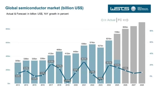 与此同时,2025年上半年半导体也呈现增长态势。世界半导体贸易统计组织(WSTS)数据显示,今年1~6月全球半导体市场规模达3460亿美元(注:现汇率约合2.48万亿元人民币),同比增长18.9%;一季度市场规模约1670亿美元,同比增长18.1%;二季度约1800亿美元,同比增长19.6%。