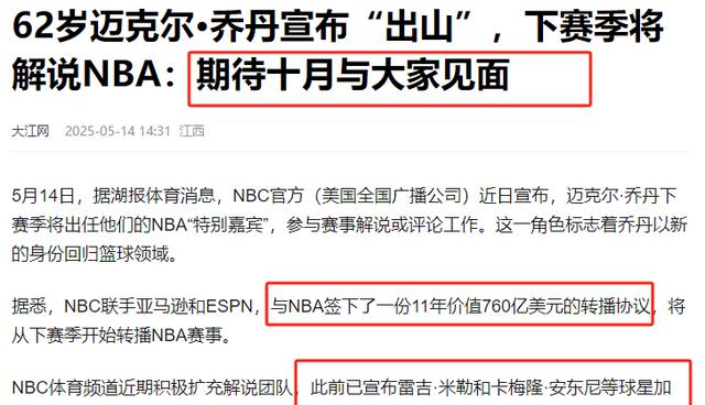 原文刊载于大江网2025-05-14关于“62岁迈克尔·乔丹宣布“出山”,下赛季将解说NBA:期待十月与大家见面”