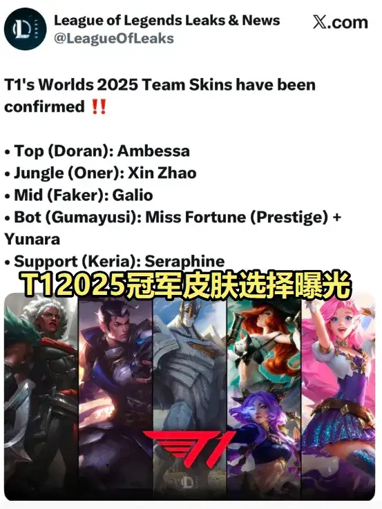 今天咱们来聊聊全球总决赛冠军皮肤的大瓜。虽然离S赛冠军皮肤正式发布还有一段时间,但外网已经有人爆料了T1战队的皮肤选择名单。消息一出,整个电竞圈直接炸了——尤其是Faker的选择,让无数老玩家直呼:加里奥终于等到这一天了!