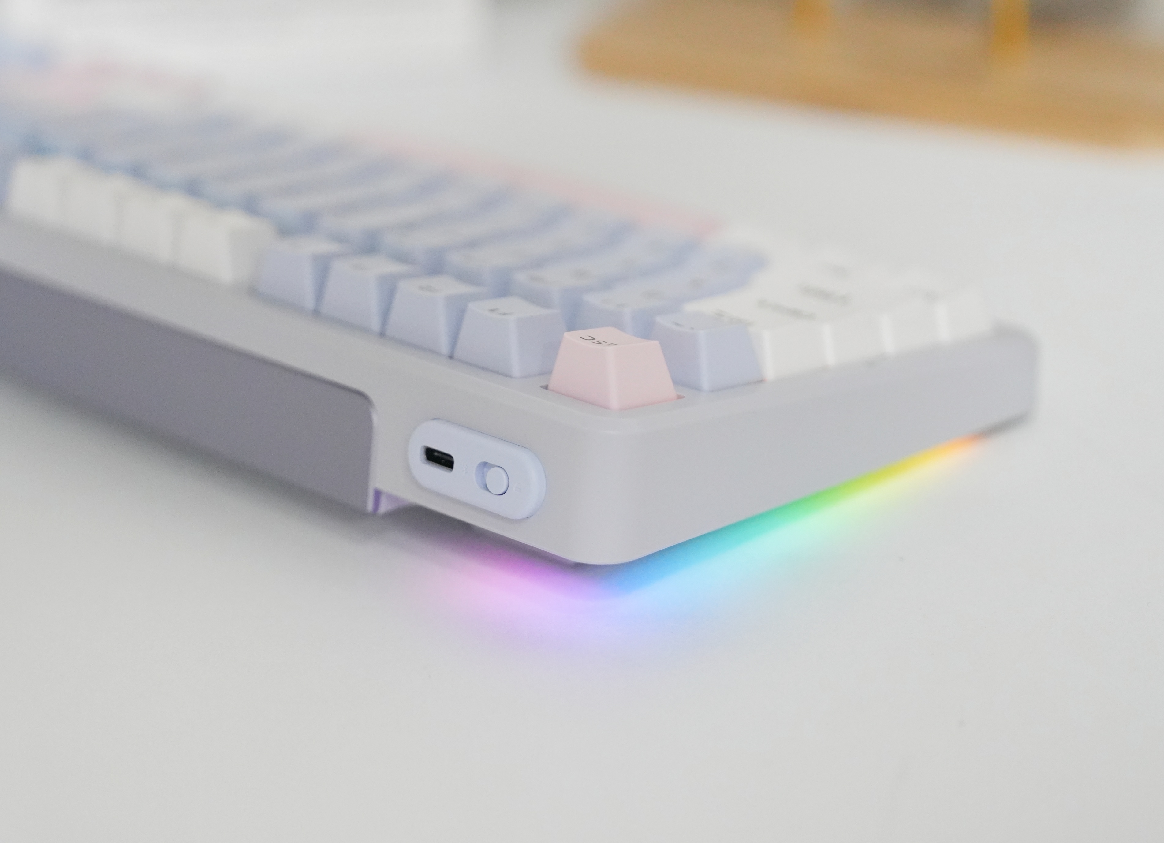 当我一收到雷柏V700 DIY-98机械键盘的时候,我立马就给拆开了,其配件包含拔键拔轴器和数据线。然后在配色上的话,其提供有“初号骑士”、“莫奈仙踪”和“幻影机甲”,这一次就连配色的名字都是如此的高大上,而我的这款便是“莫奈仙踪”,即蓝灰粉。而我一眼瞧见这外观的时候,便甚是喜爱了。