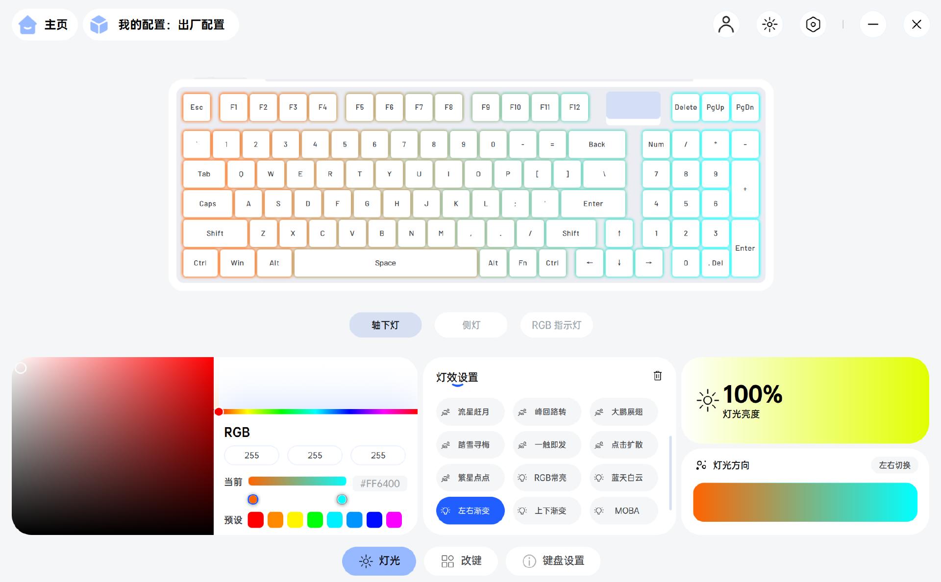 再来,雷柏V700 DIY-98机械键盘在背光上也挺有想法,除了幻彩RGB按键背光,预设了12种背光模式,每一种灯效的切换都带来了不一样的感觉。还有氛围侧灯带,也预设了3种背光模式,同样也是很好看。甚至支持按键亮度可调、按键速度可调。此外,还有“时空幻境仓”下的多功能装饰灯,这个就是放接收器的地方,也支持更改颜色,但需通过驱动来实现,同时也可作为电量指示灯,FN+空格键可实时查看。相信但凡有看过它的灯效的话,一定会让你爱不释手。