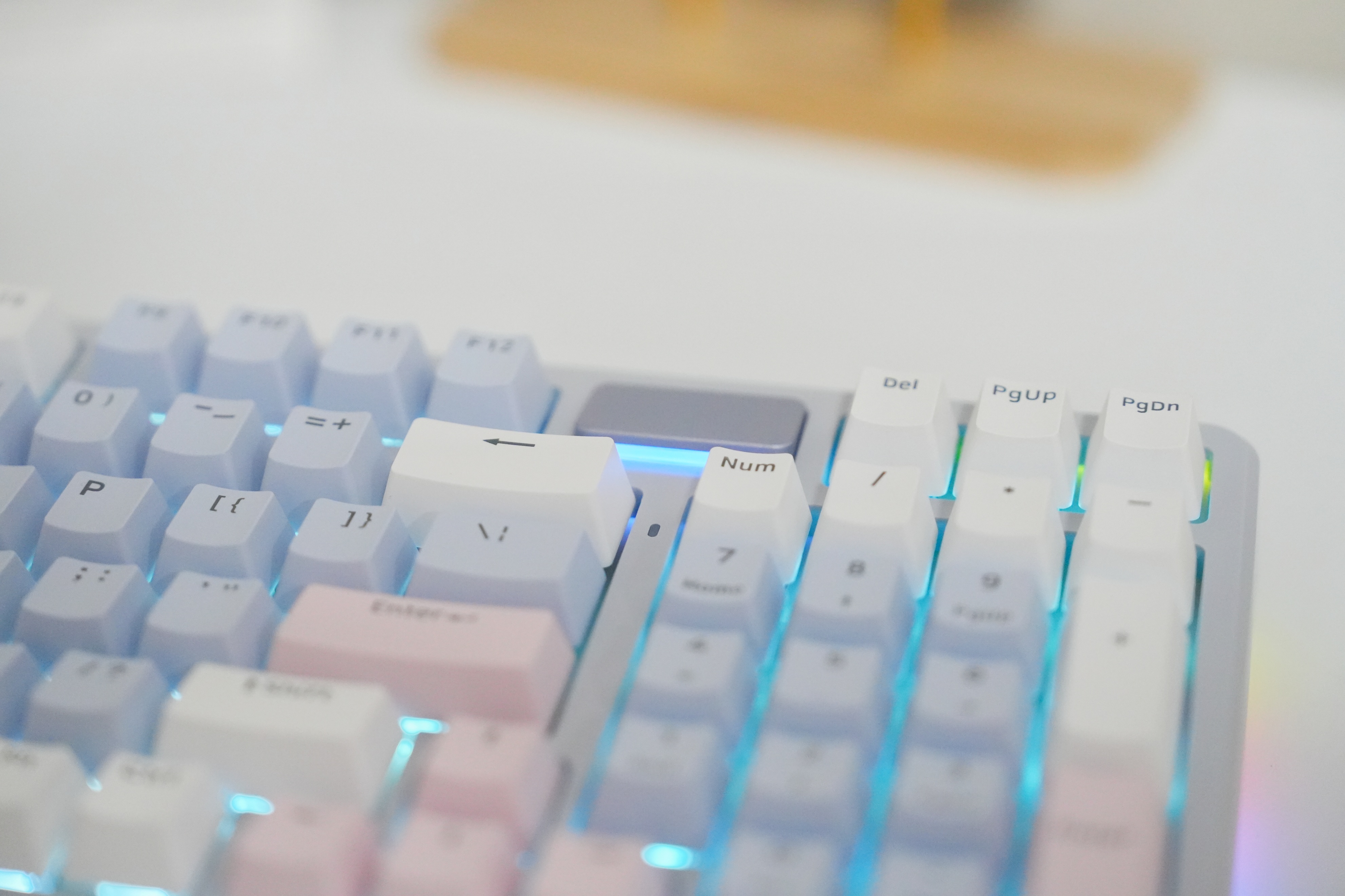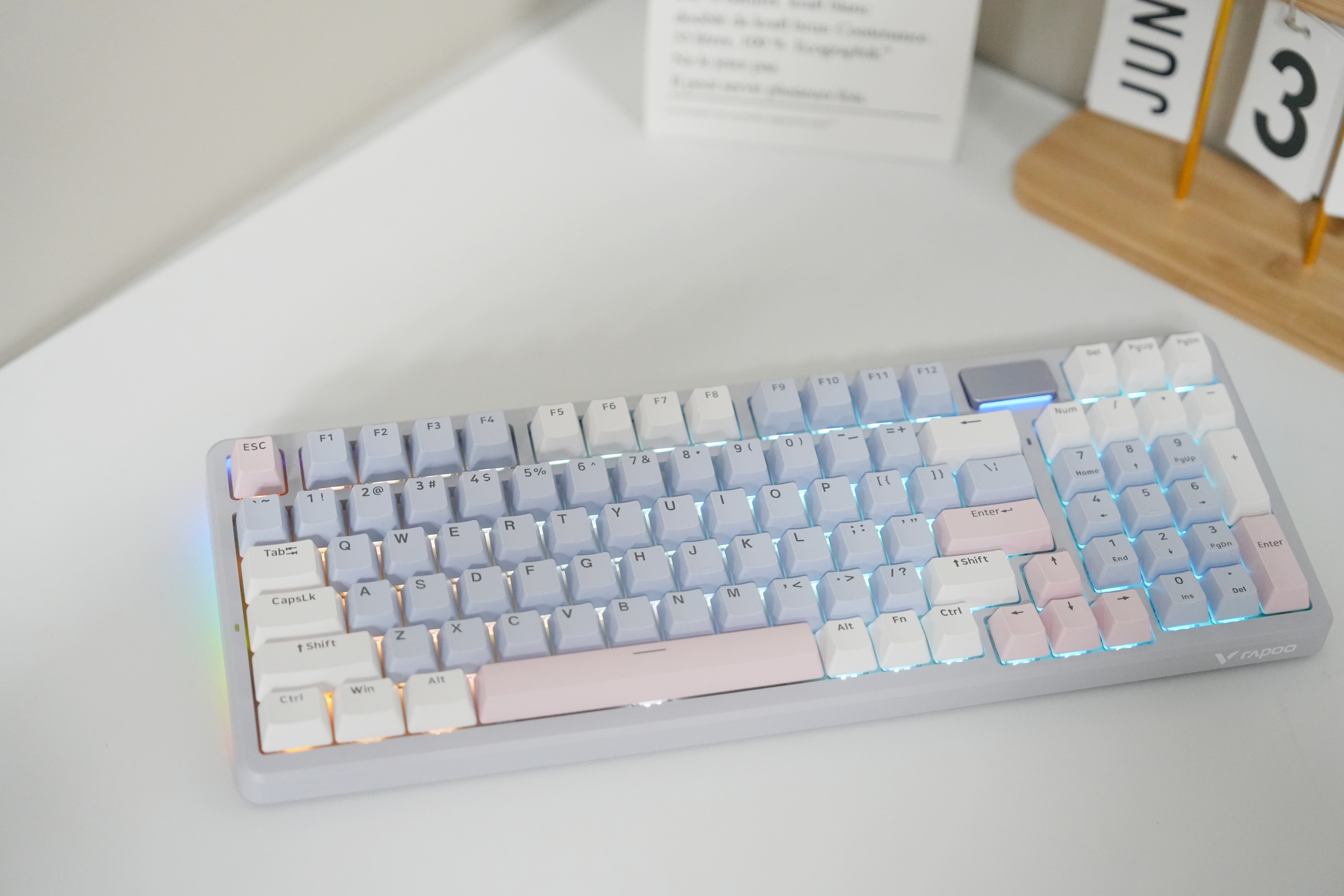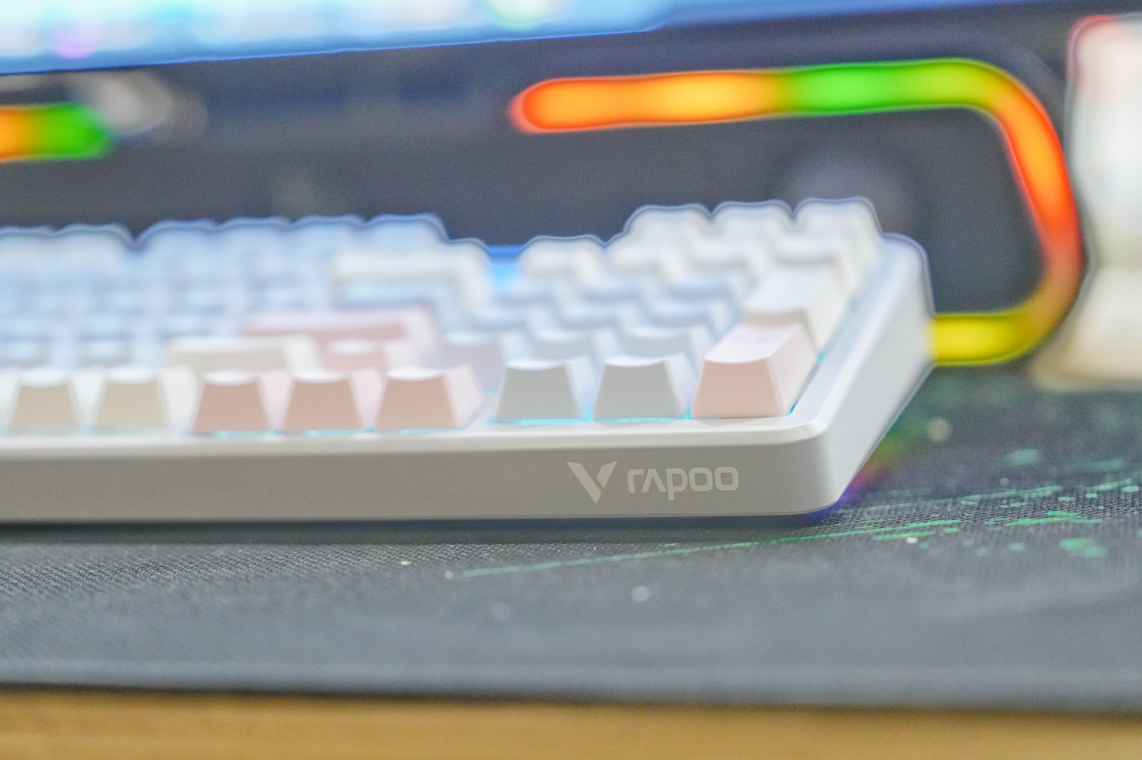 看得出来,雷柏V700 DIY-98机械键盘在外观设计上着实下了功夫,每一个细节几乎都做到了完美的地步。在其右下角的地方留有“Rapoo”的标志,有利于用户们对其加深印象,然后蓝灰粉的布局设计得恰到好处,每一个键帽都让人看着很是舒适,当然最关键的还是配色设计得好,隐隐约约中带有一种“朦胧”的质感,且也不会显得太抢眼,太突兀,单就这一外观设计上来说,我真的爱了。