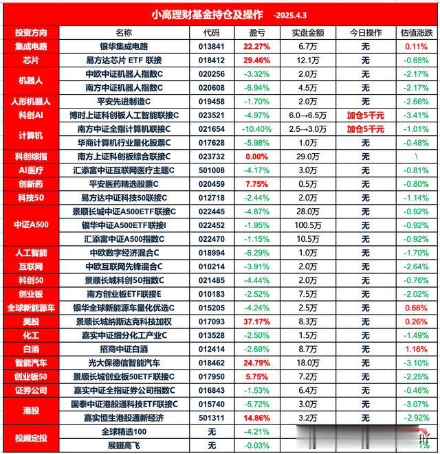 行情观点:A股今天整体呈现出近乎普跌的行情走势。白酒、电力、农业、地产等避险板块逆市小涨;科技、光伏、医疗等板块跌幅居前。关税靴子落地后,情绪处于消化阶段。小高择机酌情低吸补点仓,今天加仓博时上证科创板人工智能和南方中证全指计算机基金,其他不动。稳住节奏,相信风雨过后,定见彩虹!无论多忙小高都会坚持分享与更新自己的操作策略,希望大家都能点赞、点关注支持下小高,你们的支持真的就是小高坚持每天分享基金操作策略的最大动力!
