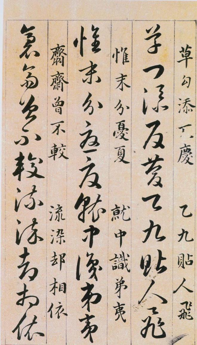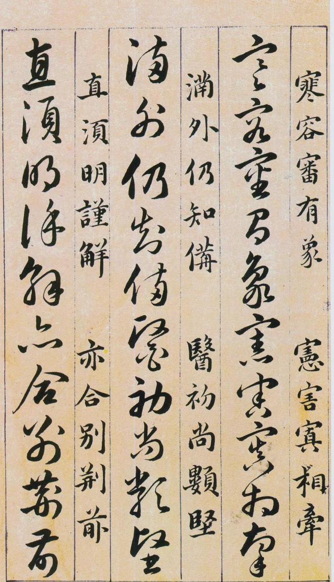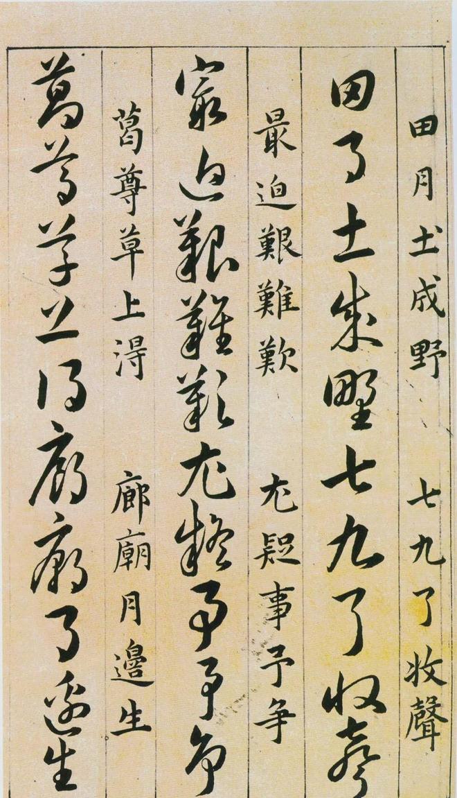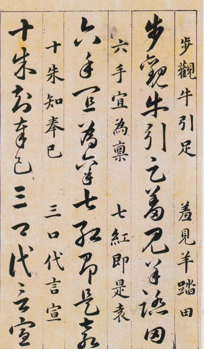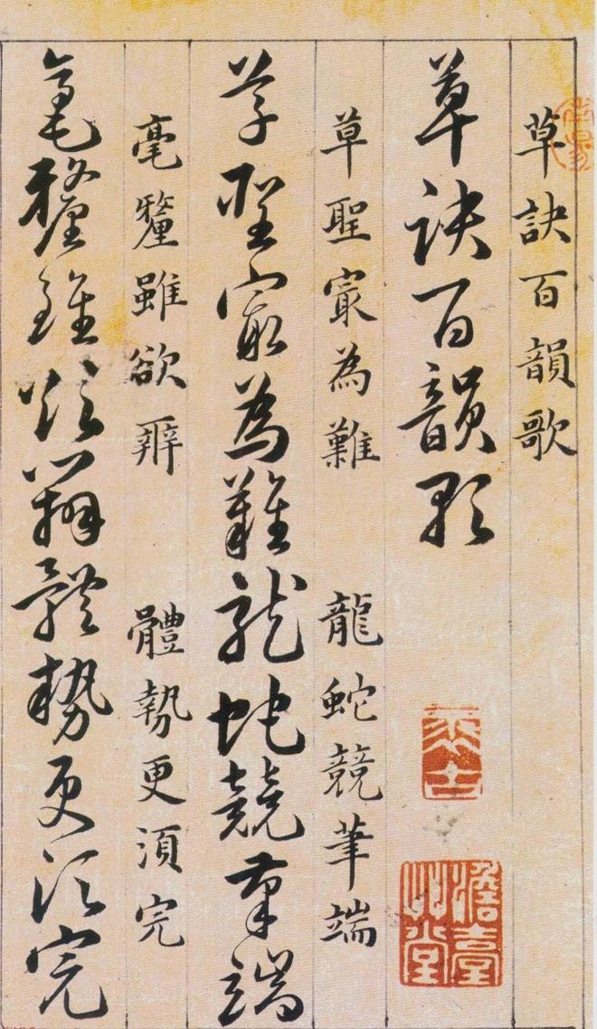 《草诀百韵歌》是明韩道亨于万历四十一年(1613年)书写的。《草诀百韵歌》是把比较通行的草字集中起来,找出它的结体和行笔中的某些规律,编成五字一句的韵文。例如把不易区别的字列在一起,指出差异之处,以便於记忆,第三韵“有点方为水,空挑即是言”,是指草写“水”字、“言”字的差异只在於“水”字有一点,而“言”字只空挑一笔;又如把某一草字的结构特点加以说明。