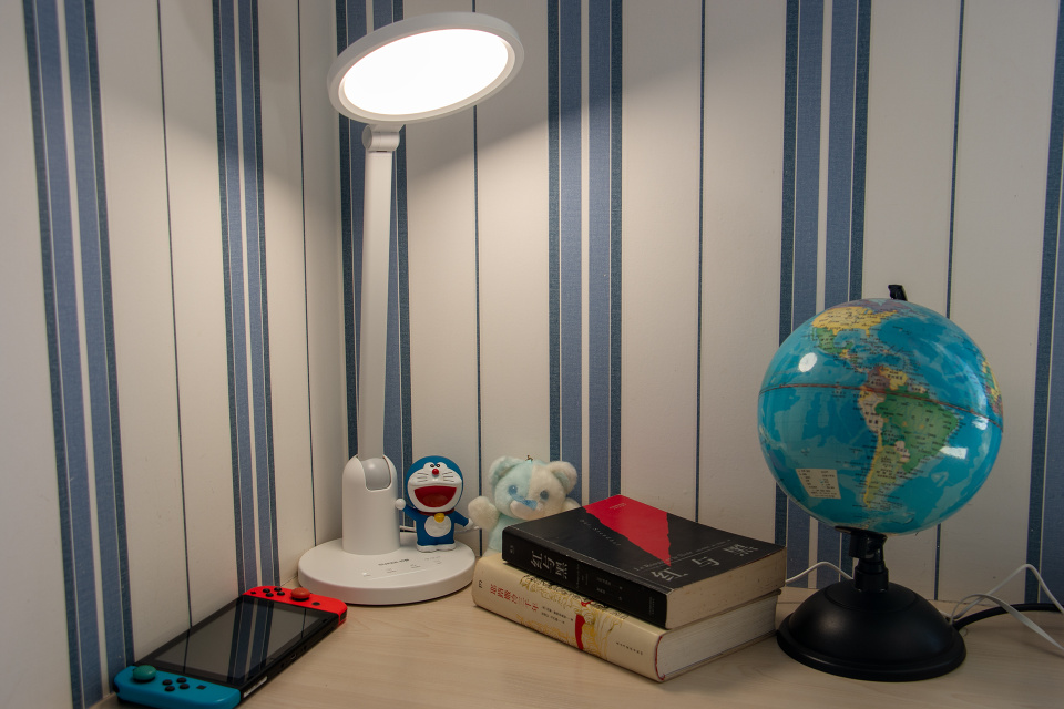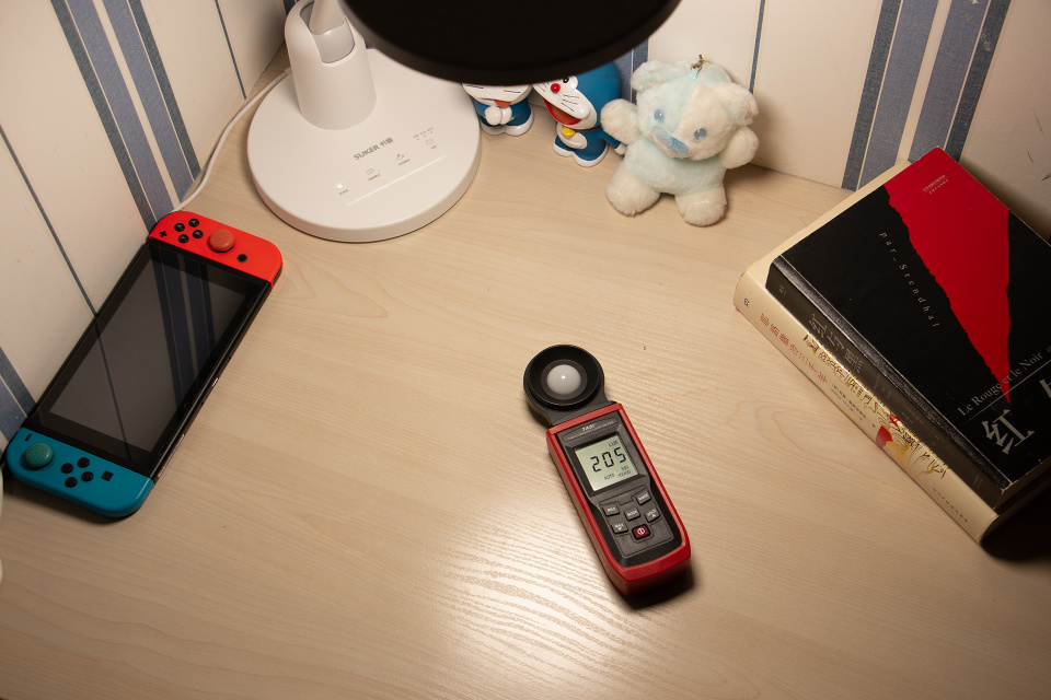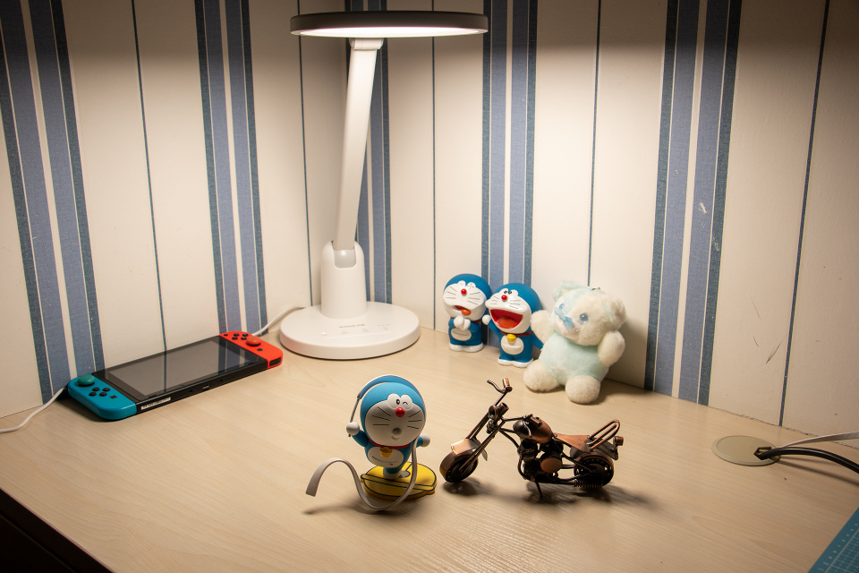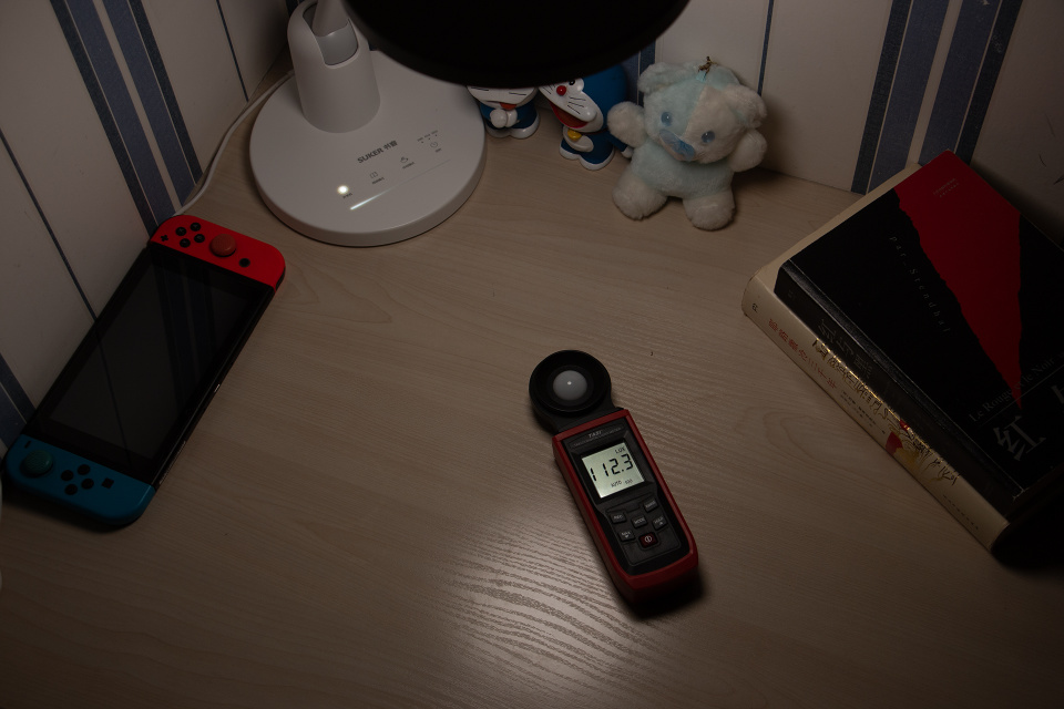 书客护眼台灯还采用了DT多维漫射2.0技术,使得灯光具有一定的弱化阴影的效果,不会形成一般台灯的硬阴影效果,如上图所属,比较极限的情况下,摆件下方的阴影不是全黑的硬阴影,而是比较模糊的阴影,这正是这项技术的特点。同时也能看出其光照面积还是非常大的。