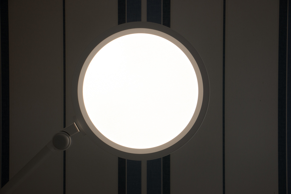 可以看到,书客护眼台灯的均光板并不像普通照明灯均光板一样是个整体白板,而是内部全部是蜂窝状的小网格,这就是其OCLT光透镜技术的核心技术所在。同时无论在高光还是低照度下,可以看出其亮度非常均匀,这个特性使得其增加了光照面积,换句话就是使得投射到桌面的光线在很大范围内都非常均匀,不会出现中心亮度过高而周围亮度衰减过快的情况。