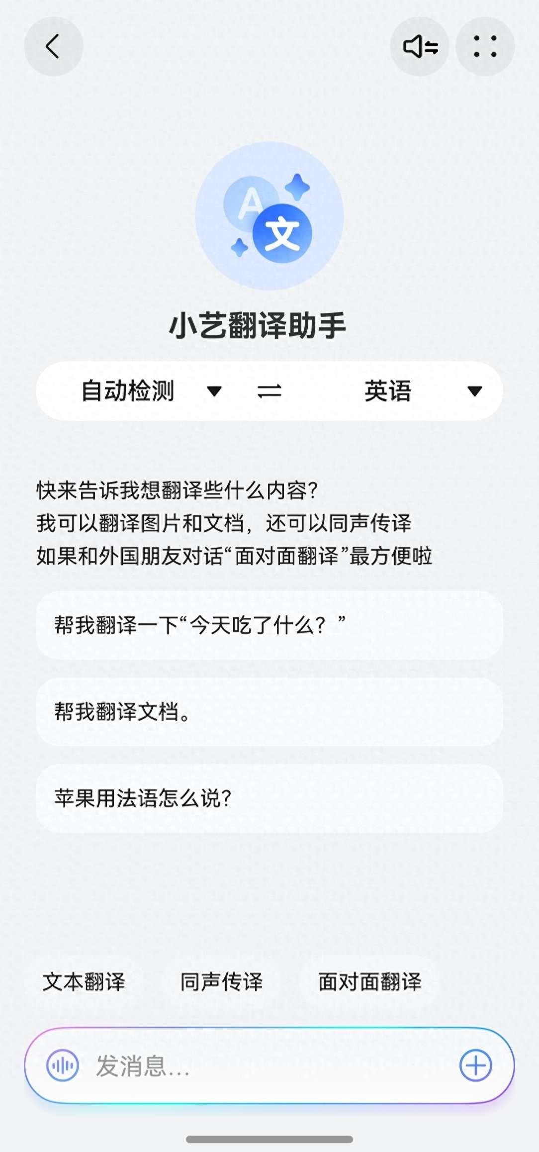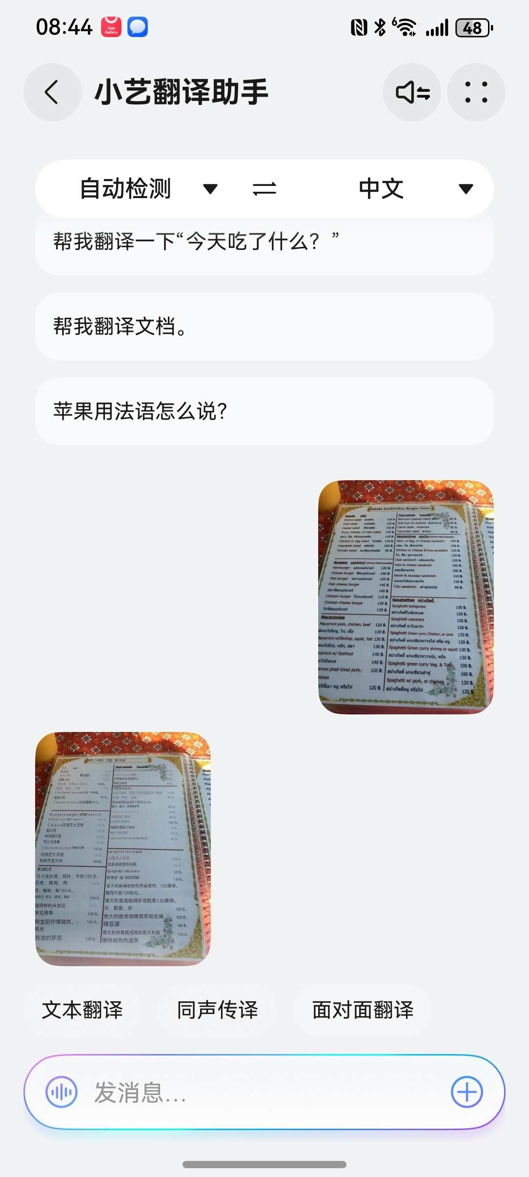 正当我们对着一份手写菜单面面相觑,准备使出“看图说话”时,我灵机一动,想起我的鸿蒙5手机——华为Pura 80,在小艺App-发现-智能体市场里找到了“小艺翻译助手”Agent,向它寻求帮助。