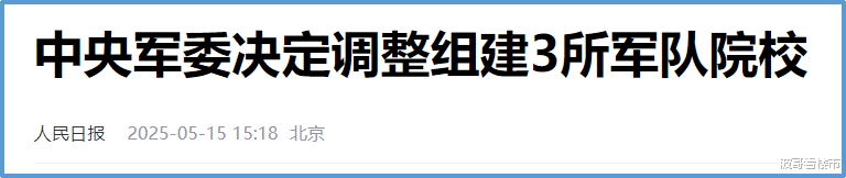 据人民日报消息,5月15日下午,国防部新闻局副局长、国防部新闻发言人蒋斌大校介绍,近日,中央军委决定,调整组建中国人民解放军陆军兵种大学、中国人民解放军信息支援部队工程大学、中国人民解放军联勤保障部队工程大学等3所院校。