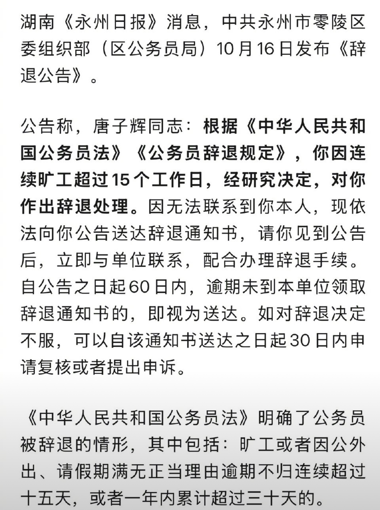 最近,湖南永州的一则《辞退公告》在网络上炸开了锅,主角是唐子辉同志,一名本应恪尽职守的公务员,却因连续旷工超过15个工作日,被中共永州市零陵区委组织部(区公务员局)正式辞退。这则公告,像一颗石子投入平静的湖面,激起了层层涟漪,让人不禁深思:公务员,这个承载着公共责任与社会期待的职位,究竟该如何被对待?