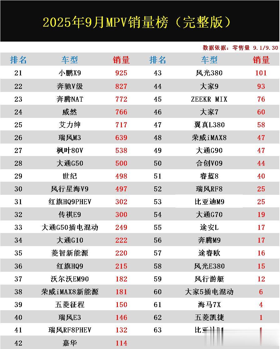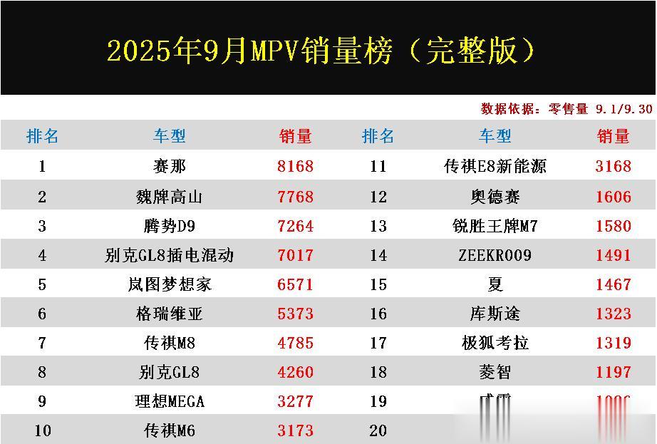 导读:2025年9月MPV零售量排名已出炉,内部呈现出“新旧动能转换,多元需求并存”的复杂局面。以赛那、GL8系列为代表的经典与腾势D9、魏牌高山等全新新能源产品在头部市场展开激烈角逐,另一方面,市场尾部聚集了大量车型,预示着未来可能出现的洗牌与整合。随着新能源技术的进一步普及和消费者需求的不断细化,MPV市场的竞争格局正在持续演变。从榜单数据来看,市场头部效应显著,新能源车型渗透率持续提升,而传统燃油车型亦在细分市场保持稳定表现。其中丰田燃油车赛那再次拿下销量冠军宝座,魏牌高山也已异军突起荣获亚军,腾势D9排名略有下滑,别克GL8插电混动,岚图梦想家均名列前五,格瑞维亚、传祺M8、别克GL8、理想MEGA、传祺M6等车型表现也都十分坚挺,排名均稳居前十。