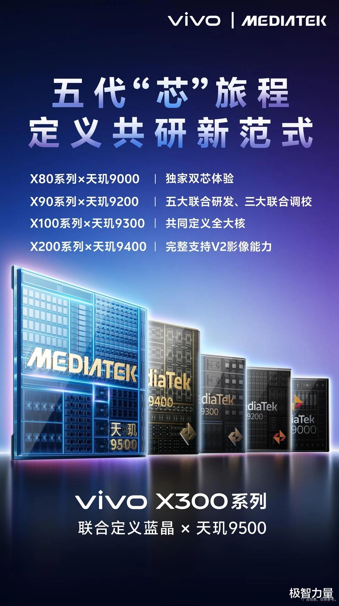 vivo X300系列搭载的天玑9500与蓝厂深度合作,历时三年打造。成为安兔兔首个突破400万分大关的手机,展现出了强大的性能实力。影像超能效NPU区域的实现,让手机在追焦和快门响应方面有了质的飞跃。自研蓝图影像芯片V3 +与天玑9500双芯合体,全球首发4K 60fps电影人像视频,让手机的视频拍摄能力达到了一个新的高度。