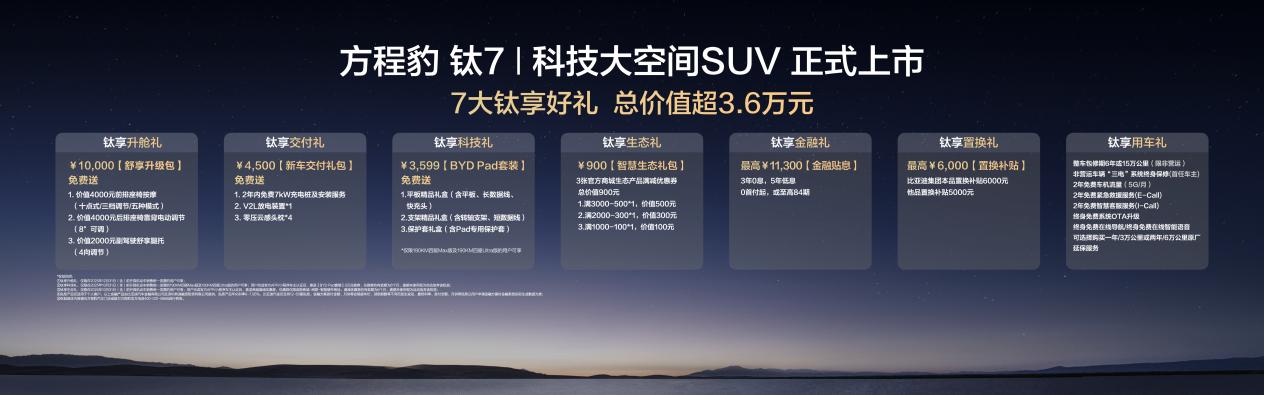 在购车权益上,方程豹更是诚意十足,新车共推出4个配置版本,售价17.98万元-21.98万元,款款越级,款款超值,下单即刻享受最高价值超3.6万元的上市权益,让每一个家庭都能轻松拥抱钛7,让美好生活触手可及。
