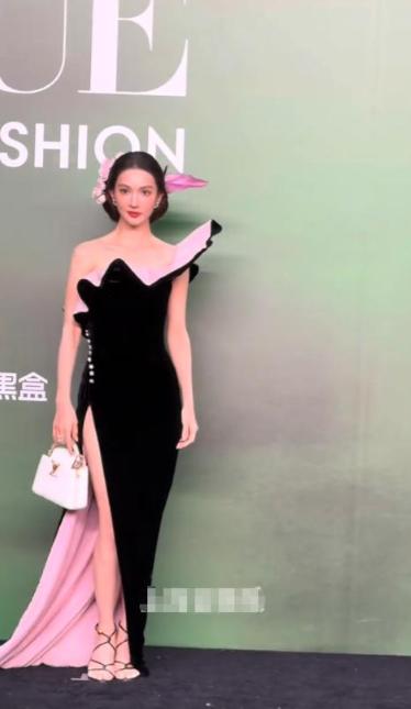 杨幂以全身黑色礼服亮相,带有“黑色彩虹拱桥”元素,腿部高露肤设计成为亮点。