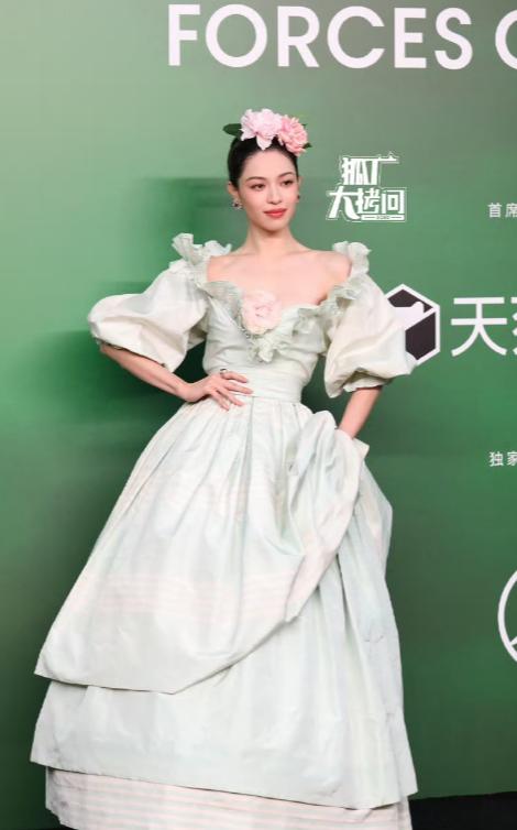 钟楚曦的造型中,花朵在头顶、胸前和手腕呈S形分布